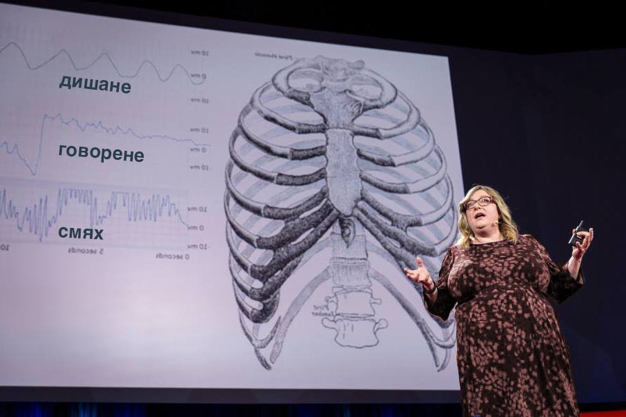 На по-базисно ниво, не знаем. Просто това е нещото, което правим. Д-р Жаак Панкшеп, който е медийно известен с изследванията си с плъхове, казва че в сърцето си смехът е покана за игра. И аз мисля, че има тази положителна валентност – безобидна, не стресираща дейност – на която каниш хората да се приседният, емоционално. Има интересни изследвания, които показват, че при утвърдените връзки, при дългогодишните брачни двойки например, хората могат да използват смеха като начин да регулират емоциите си заедно. Мисля, че това е много интересно, защото предполага, че със смеха не само сигнализираме на някого, че го харесваме, но бихме могли да изградим и по-дълбока връзка и пак чрез смях, кога и как, да се караме взаимно да се чувстваме по-добре в тежки ситуации. Смятам, че всички биха желали да знаят повече за това.