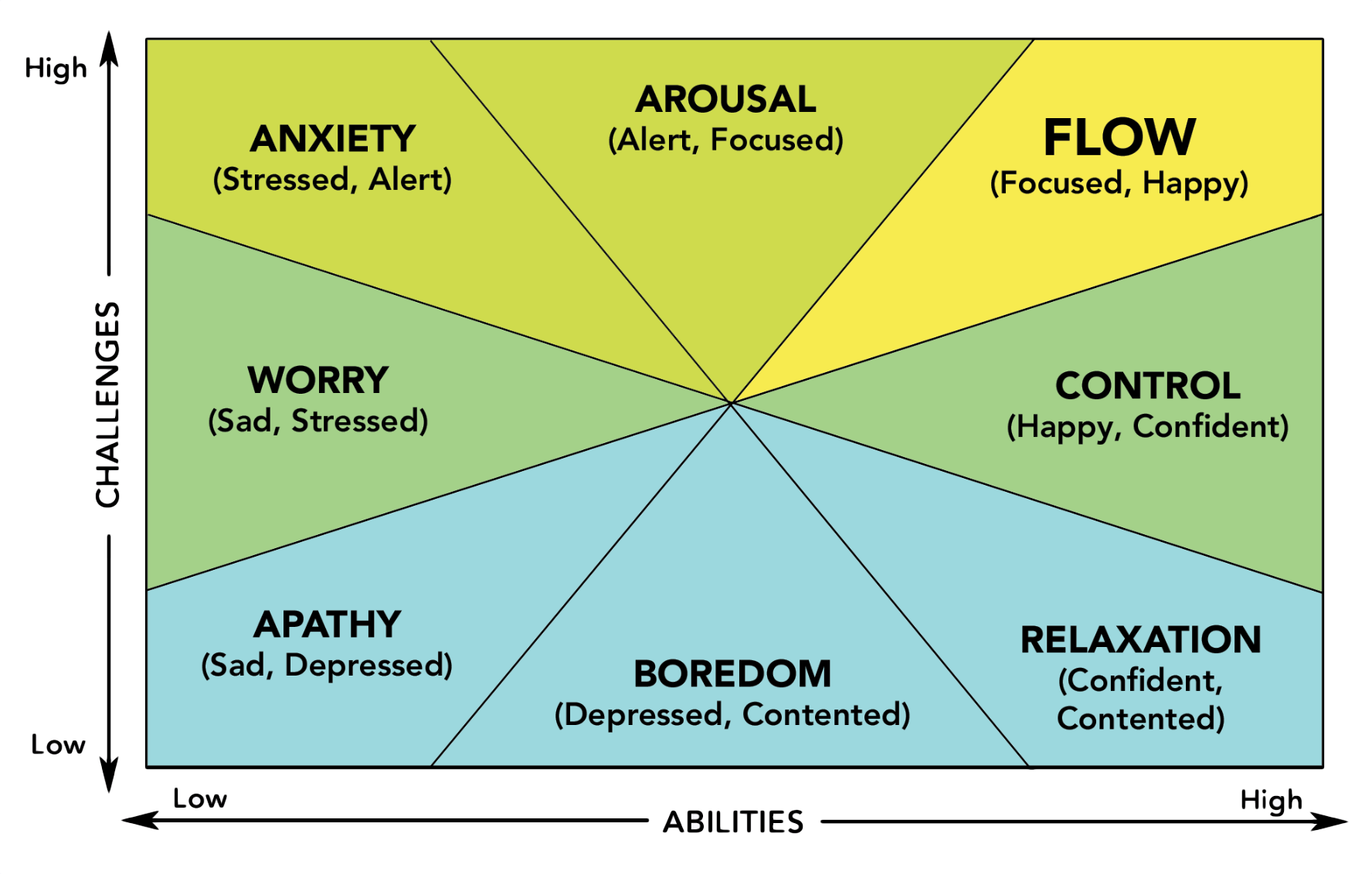 In my studies, I usually measure 8 states of being: Activation, Flow, Control, Relaxation, Boredom, Apathy, Worry, and Anxiety. These states depend on different ratios between the Challenges the person sees and his perception of his own Skills.